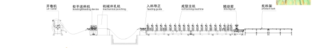 上料平臺—開卷機—伺服送料—沖孔沖壓—輥壓成型—切斷—翻轉(zhuǎn)送料