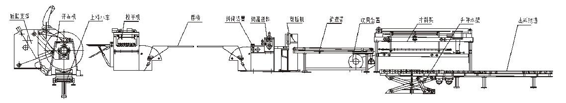 生產(chǎn)線主要由上料小車、開(kāi)卷機(jī)、校平機(jī)、送料機(jī)構(gòu)、剪板輸送裝置、堆垛裝置等組成。